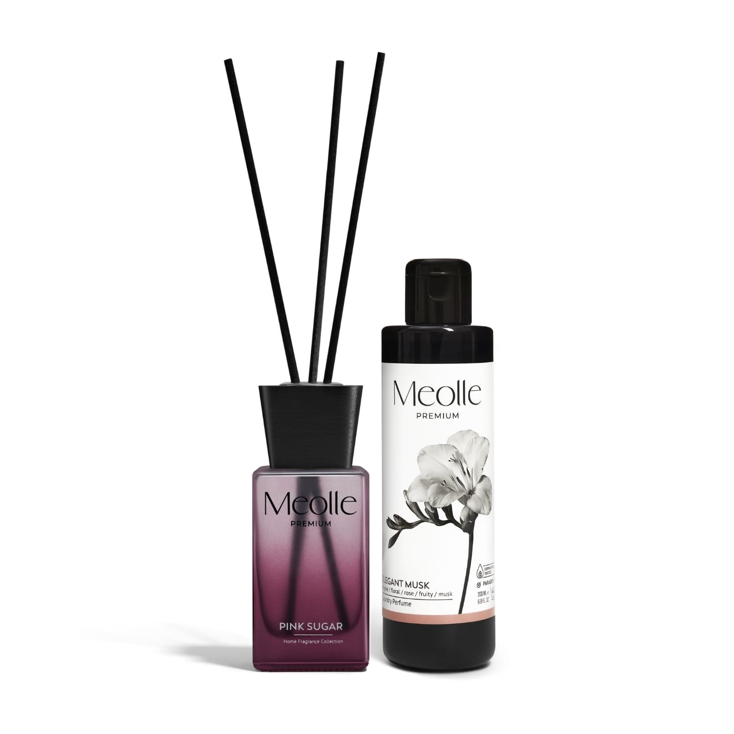 Lasă-te învăluit de arome sofisticate ce conține un odorizant cu bețișoare Pink Sugar (100 ml) ce adaugă un parfum dulce și pudrat în orice încăpere, și parfumul de rufe Elegant Musk, cu note de mosc, flori și fructe, care oferă hainelor un miros rafinat.
